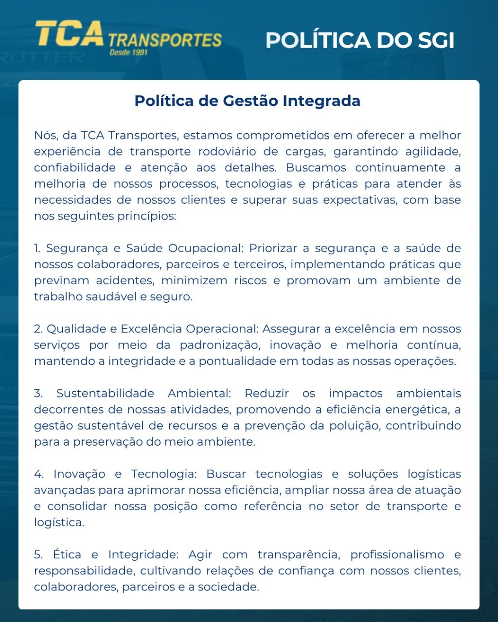 Desde 1991, a TCA Transportes conecta negócios com segurança, agilidade e eficiência. Fundada como uma empresa familiar, nossa missão é oferecer soluções em transporte de cargas a granel, com um atendimento próximo e personalizado que atende desde indústrias até agentes de cargas portuárias.